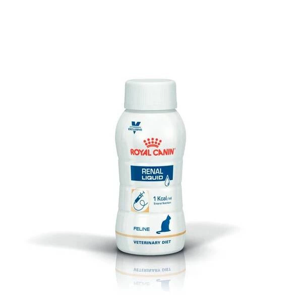 Royal Canin Veterinary Diet Cat Renal Liquid is a complete dietary cat food formulated to support renal function in patients with chronic or temporary renal failure due to its low phosphorus content and low protein content high. RENAL DIETARY MANAGEMENT Formulated to support renal function in case of renal insufficiency: high quality proteins and restricted levels of phosphorus. Contains EPA + DHA and antioxidants. COMPLETE NUTRITION Complete and balanced liquid diet to support the renal function in case of renal insufficiency, for cats requiring assisted enteral nutrition. ADAPTED ENERGY (1 kcal/ml) High energy density that provides daily energy requirements in a reduced feeding volume. ANTIOXIDANT COMPLEX The synergistic antioxidant complex (including high levels of Vit E, Vit C, taurine & lutein) helps neutralise free radicals. EASY TUBE FEEDING Liquid formula with adapted viscosity for an easy use whatever the tube size. Daily Feeding Recommendation Cat's Weight (kg) Liquid ml/day Cat's Weight (kg) Liquid ml/day 2 109 5 217 2.5 129 6 248 3 148 7 279 3.5 166 8 308 4 183 9 337 4.5 200 10 364 Shake before use. After opening keep refridgerated and use within 24 hours. Recommended for Acute Kidney injury Chronic Kidney Disease Hepatic encephalopathy Composition Milk and milk derivatives, cereals, oils and fats, vegetable protein extracts, mineral salts, vegetable by-products. Sources of protein: low lactose milk, caseinate, soy protein concentrate. Additives (kg) Nutritional Additives: Vitamin A: 3330 IU, Vitamin D3: 320 IU, E1 (Iron): 30 mg, E2 Manganese): 2.4 mg, E6 (Zinc): 28 mg, E8 (Selenium): 0.15 mg. Analytical constituents (per 100 ml) Proteins 7 g Fat 5.5 g Carbohydrates 6.6 g ENA 5.1 g Total Fiber 0 g Raw food fiber 0 g Omega 6 0.73 g Omega 3 0.3 g EPA + DHA 0.14 g Calcium 0.10 g Phosphorus 0.08 g Sodium 0.08 g Metabolisable energy 108 kcal