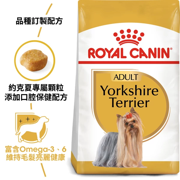 Suitable for Yorkshire Terriers over 10 months old, ROYAL CANIN Yorkshire Terrier Adult is specially formulated with all the nutritional needs of your adult dog in mind.ROYAL CANIN Yorkshire Terrier Adult contributes to maintaining the health of your Yorkie's coat through an adapted content enriched by essential omega-3 fatty acids (EPA & DHA), omega-6 fatty acids, borage oil, and biotin.ROYAL CANIN Yorkshire Terrier Adult satisfies even the fussiest of appetites, thanks to a combination of exceptional flavours that your dog won't be able to resist!Good oral hygiene is an important consideration when selecting your dog's food. ROYAL CANIN Yorkshire Terrier Adult helps slow down tartar formation through a precise inclusion of calcium chelators within the kibble.To cater to each dog's individual preferences, ROYAL CANIN Yorkshire Terrier Adult is also available as wet food in a soft and tasty loaf.If you're considering mixed feeding, simply follow our feeding guidelines to ensure your dog gets an accurate amount of both wet and dry food for optimal benefit. Coat health This exclusive formula contributes to maintaining health of the Yorkshire’s long coat. Enriched with adapted content of Omega 3 fatty acids (EPA & DHA), Omega 6 fatty acids, borage oil and biotin. Satisfies fussy appetite This formula satisfies the fussiest of appetites thanks to a combination of exceptional flavours. Healthy ageing This formula supplies a selection of nutrients to help maintain health in mature dogs. Exclusive kibble This formula helps reduce the risk of tartar formation thanks to calcium chelators. COMPOSITION: dehydrated poultry protein, maize flour, rice, animal fats, vegetable protein isolate*, maize, hydrolysed animal proteins, maize gluten, vegetable fibres, beet pulp, fish oil, minerals, soya oil, yeasts and parts thereof, fructo-oligo-saccharides, hydrolysed yeast (source of manno-oligo-saccharides), borage oil (0.1%), hydrolysed crustaceans (source of glucosamine), marigold extract (source of lutein), hydrolysed cartilage (source of chondroitin). ADDITIVES (per kg): Nutritional additives: Vitamin A: 29500 IU, Vitamin D3: 800 IU, Biotin: 3 mg, E1 (Iron): 45 mg, E2 (Iodine): 4.5 mg, E4 (Copper): 14 mg, E5 (Manganese): 58 mg, E6 (Zinc): 137 mg, E8 (Selenium): 0.1 mg - Technological additives: Clinoptilolite of sedimentary origin: 5 g - Sensory additives: Tea extract (source of poly- phenols): 150 mg - Preservatives - Antioxidants. ANALYTICAL CONSTITUENTS: Pro-tein: 28.0% - Fat content: 18.0% - Crude ash: 5.1% - Crude fibres: 3.0% - Per kg: Omega 6 fatty acids: 33.7 g - Omega 3 fatty acids: 7.5 g including EPA/DHA: 3 g - Pentasodium triphosphate: 3.5 g. FEEDING INSTRUCTIONS: see table. Batch number, factory registration number and best before date: see information on packaging. To be stored in a cool, dry place. *L.I.P.: protein selected for its very high digestibility.