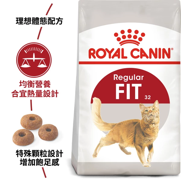 ROYAL CANIN Fit 32 is suitable for adult cats between 1-7 years old, it's been specially designed to meet all of your cat's nutritional requirements for supporting and maintaining the healthy situation that your cat is currently in.Your cat needs high quality nutrition to meet all the requirements of adulthood - that's why ROYAL CANIN Fit 32 has an optimal nutrient profile that contains the right level of beneficial nutrients to help support and maintain the good health of your adult cat.What's more, ROYAL CANIN Fit 32 is formulated with a balance of beneficial nutrients - such as a variety of vitamins and minerals - to help in maintaining a healthy urinary system for adult cats like yours.Thanks to the inclusion of specific dietary fibres, ROYAL CANIN Fit 32 also helps to rid your cat of hair and fur it may have ingested. This ultimately means that occurrence of hairballs is significantly reduced. Optimal nutrient profile To meet the specific requirements of adulthood, cats need nutrition of a high quality. Fit 32 is a balanced and complete feed which contains the right level of beneficial nutrients to maintain adult cats in good health. Healthy weight The adapted calorie content of the Fit 32 formula helps maintain the ideal weight of adult cats having a moderate amount of exercise. Hairball reduction Fit 32 helps stimulate intestinal transit and the elimination of ingested hair thanks to specific fibres including psyllium. Urinary health Formulated to help maintain health of an adult cat’s urinary system. COMPOSITION: dehydrated poultry protein, rice, wheat, animal fats, maize, vegetable fibres, wheat flour, hydrolysed animal proteins, vegetable protein isolate*, maize gluten, yeasts and parts thereof, beet pulp, soya oil, fish oil, psyllium husks and seeds, minerals, hydrolysed yeast (source of manno-oligo-saccharides), marigold extract (source of lutein). ADDITIVES (per kg): Nutritional additives: Vitamin A: 13000 IU, Vitamin D3: 700 IU, E1 (Iron): 32 mg, E2 (Iodine): 3.2 mg, E4 (Copper): 10 mg, E5 (Manganese): 42 mg, E6 (Zinc): 126 mg, E8 (Selenium): 0.08 mg - Zootechnical additives: Ammonium chloride: 5g - Preservatives - Antioxidants. ANALYTICAL CONSTITUANTS: Protein: 32% - Fat content: 15% - Crude ash: 7.2% - Crude fibres: 4.6%. * L.I.P.: protein selected for its very high digestibility.