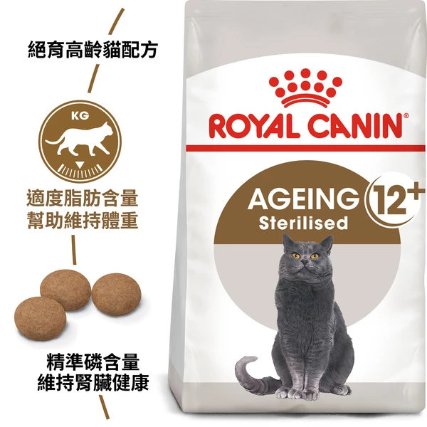 ROYAL CANIN Senior Ageing 12+ is suitable for cats over 12 years of age and is specially formulated with the nutritional needs of senior cats like yours in mind. This food contains highly palatable kibble with a double texture (crunchy outside, soft inside) that helps to stimulate your senior cat's general appetite.ROYAL CANIN Senior Ageing 12+ contains a patented complex of antioxidants that support senior cats throughout the ageing process. Thanks to a moderate phosphorus level, ROYAL CANIN Senior Ageing 12+ also helps to support healthy kidney function, which is highly beneficial in senior cats.To cater to each cat's individual preferences, ROYAL CANIN Senior Ageing 12+ is also available as wet food in either a delicious gravy or succulent jelly. If you're considering mixed feeding, simply follow our feeding guidelines to ensure your cat gets an accurate amount of both wet and dry food for optimal benefit. Appetite stimulation In some senior cats, the senses of taste and smell decline with age, which leads to lower food intake and subsequent weight loss. Ageing 12++ helps stimulate the senior cat’s appetite thanks to a highly palatable, double texture kibble which is easy to chew. Healthy ageing complex Limits the consequences of ageing on cognitive function, mobility, and oxidative stress thanks to specific nutrients (tryptophan, EPA-DHA, and a patented* complex of antioxidants including lycopene and beta-carotene). *France, patent No EP1146870. Renal health A decline in kidney function is common in older cats. Ageing 12+ contains a moderate phosphorus level to help support renal health. Urinary health Formulated to help maintain health of an adult cat’s urinary system. COMPOSITION: vegetable protein isolate*, precooked wheat flour, animal fats, dehydrated poultry protein, rice, maize, vegetable fibres, hydrolysed animal proteins, chicory pulp, minerals, fish oil, soya oil, yeasts and parts thereof, tomato (source of lycopene), fructo-oligo- saccharides, psyllium husks and seeds, hydrolysed yeast (source of manno-oligo-saccharides), hydrolysed crustaceans (source of glucosamine), borage oil, marigold extract (source of lutein), hydrolysed cartilage (source of chondroitin). ADDITIVES (per kg): Nutritional additives: Vitamin A: 19000 IU, Vitamin D3: 700 IU, E1 (Iron): 37 mg, E2 (Iodine): 3.7 mg, E4 (Copper): 11 mg, E5 (Manganese): 48 mg, E6 (Zinc): 145 mg, E8 (Selenium): 0.06 mg - Sensory additives: Tea extract (source of polyphenols): 0.6 g - Preservatives - Antioxidants. ANALY-TICAL CONSTITUENTS: Protein: 30% - Fat content: 19% - Crude ash: 5.3% - Crude fibres: 4.4% - Phosphorus: 0.6% - Per kg: Omega 3 fatty acids: 10.9 g - Lycopene: 8 mg. FEEDING INSTRUCTIONS: see table. Batch number, factory registration number and best before date: see information on packaging. To be stored in a cool, dry place. For RSA: Guaranteed analysis g/kg: Crude protein (min) 280 - Moisture (max) 70 - Crude fat (min) 170 - Crude fibre (max) 54 - Crude ash (max) 58. Product registration number: V23337 - Act 36/1947. For Namibia: N-FF XXXX. *L.I.P.: protein selected for its very high digestibility. *L.I.P.: protein selected for its very high digestibility.