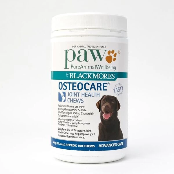 Each PAW Osteocare chew contains: *500 mg Glucosamine Sulfate: to provide cartilage nutrition for joint cartilage health and joint function. *250 mg Chondroitin Sulfate: is a major component of joint cartilage and is required for cartilage and joint health. *Balanced combination of other nutrients for joint health: PAW Osteocare chews also contains other ingredients such as MSM and a balanced blend of vitamins and minerals that work together to maintain the health of your dog’s joints. *Highly palatable chew: A tasty kangaroo based chew that is easy to give to your pet on a daily basis. Dosage Initial Dose: For best results an initial daily dose should be provided as follows for the first 4 weeks: 5 – 10 kg: 1 Chew 11 – 25 kg: 2 Chews Over 25 kg: 3 Chews For dogs less than 5 kg a maximum of ½ chew daily should be administered. Maintenance Dose (also suitable for joint health). After the first 4 weeks, the daily dose should be reduced to the following: 5 – 10 kg: ½ Chew 11 – 25 kg: 1 Chews Over 25 kg: 2 Chews For dogs less than 5 kg a maximum of ½ chew daily should be administered. This dose is also suitable to aid joint health in younger dogs that have a pre-disposition to a joint problems later in life. Ingredients Active ingredients per chew: 500 mg glucosamine sulphate 250 mg chondroitin sulphate Each chew also contains: MSM Vitamin C Manganese gluconate