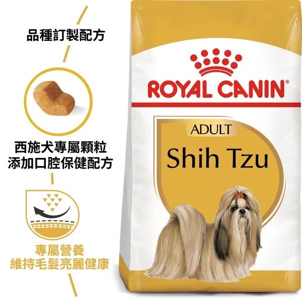 Suitable for dogs over 10 months old, ROYAL CANIN Shih Tzu Adult is specially formulated with all the nutritional needs of your adult Shih Tzu in mind.ROYAL CANIN Shih Tzu Adult contains an exclusive combination of nutrients that help to maintain your dog's skin health – which in turn positively affects the health of its coat. This formula includes the omega-3 fatty acids EPA and DHA, as well as an enrichment of borage oil Healthy skin Shih Tzu Adult helps support the skin’s “barrier” role (exclusive complex), maintain skin health (EPA & DHA, vitamin A) and nourish the coat. Enriched with borage oil. Dental health This formula helps reduce the risk of tartar formation thanks to calcium chelators. Stool & odour reduction This formula helps reduce faecal smell and volume. Exclusive kibble design: special brachycephalic jaw A kibble exclusively designed to make it easier for the Shih Tzu to pick up and to encourage him to chew. COMPOSITION: rice, dehydrated poultry protein, animal fats, vegetable protein isolate*, hydrolysed animal proteins, vegetable fibres, beet pulp, minerals, fish oil, soya oil, fructo-oli¬go-saccharides, borage oil (0.1%), marigold extract (source of lutein), hydrolysed crustaceans (source of glucosamine), hydrolysed cartilage (source of chondroitin). ADDITIVES (per kg): Nutritional additives: Vitamin A: 29500 IU, Vitamin D3: 800 IU, E1 (Iron): 56 mg, E2 (Iodine): 5 mg, E4 (Copper): 13 mg, E5 (Manganese): 63 mg, E6 (Zinc): 142 mg, E8 (Selenium): 0.15 mg - Technological additives: Clinoptilolite of sedimentary origin: 10 g - Sensory additives: Tea extract (source of polyphenols): 150 mg - Preservatives - Antioxidants. ANALYTICAL CONSTITUENTS: Protein: 24.0% - Fat content: 20.0% - Crude ash: 5.8% - Crude fibres: 3.0% - Per kg: Pentasodium triphosphate: 3.5 g - EPA/DHA: 3 g. FEEDING INSTRUCTIONS: see table. Batch number, factory registration number and best before date: see information on packaging. To be stored in a cool, dry place. *L.I.P.: protein selected for its very high digestibility.