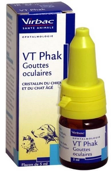 Indications : Virbac VT Phak Ocular Drops 5 ml is an eye drop against aging of the lens of dogs and cats. Composition: aqua, boric acid, niacimide (vitamin PP), sodium borate, citric acid, glycine, sodium methylparaben, sodium propylparaben, cytochrome c