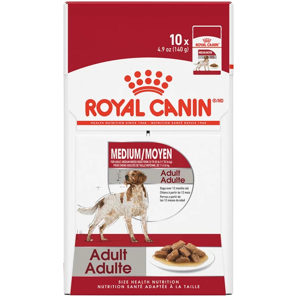 Suitable for dogs aged between 12 months and 10 years old that weigh between 11-25 kg, ROYAL CANIN Medium Adult in Gravy is specially formulated with all the nutritional needs of your medium sized adult dog in mind. ROYAL CANIN Medium Adult in Gravy supports optimal digestive health, as well as helping to maintain a healthy balance of intestinal flora.Thanks to a specific antioxidant complex and additional prebiotics, ROYAL CANIN Medium Adult in Gravy helps to support and maintain your dog's natural defences.What's more, ROYAL CANIN Medium Adult in Gravy is enriched with EPA and DHA – these Omega-3 fatty acids contribute to the maintenance of healthy skin and coat condition. To cater to each dog's individual preferences, ROYAL CANIN Medium Adult is also available as dry food, with crunchy and tasty kibble. If you're considering mixed feeding, simply follow our feeding guidelines to ensure your dog gets an accurate amount of both wet and dry food for optimal benefit. High digestibility Helps support digestive health and a balance in the intestinal flora. Natural defences Helps support natural defenses thanks to an antioxidant complex and prebiotics. Omega 3: EPA - DHA Enriched with Omega 3 fatty acids (EPA-DHA) to help maintain healthy skin. COMPOSITION: meat and animal derivatives, oils and fats, cereals, derivatives of vegetable origin, vegetable protein extracts, minerals, yeasts, various sugars. ADDITIVES (per kg): Nutritional additives: Vitamin D3: 200 IU, E1 (Iron): 3 mg, E2 (Iodine): 0.26 mg, E4 (Copper): 2 mg, E5 (Manganese): 1 mg, E6 (Zinc): 10 mg - Technological additives: Clinoptilolite of sedimentary origin: 2 g. ANALYTICAL CONSTITUENTS: Protein: 7.5% - Fat content: 5.5% - Crude ash: 1.6% - Crude fibres: 1.1% - Moisture: 81.0% - Omega 3 fatty acids: 0.1% - EPA and DHA: 0.08%. FEEDING INSTRUCTIONS: see table. Batch number, factory registration number and best before date: see information on packaging. To be stored in a cool, dry place.