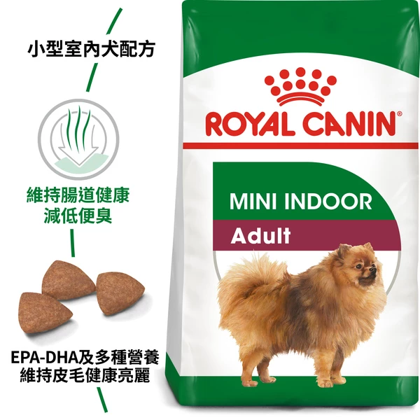 ROYAL CANIN Mini Indoor Adult is suitable for small, indoor dogs over 10 months old that weigh up to 10kg. This food is specially formulated with all the nutritional needs of your small, indoor dog in mind. ROYAL CANIN Mini Indoor Adult contains highly digestible proteins (L.I.P.) and an appropriate fibre content to align with your small dog’s nutritional needs. These nutrients contribute to supporting and maintaining your dog’s digestive health, as well as reducing the volume and odour of its stools. ROYAL CANIN Mini Indoor Adult contains L-Carnitine, a nutrient that transports fatty acids and is involved in the production of energy. In addition, the specially adapted calorie content helps to maintain your dog’s ideal bodyweight. ROYAL CANIN Mini Indoor Adult’s formula is also enriched with Omega-3 fatty acids that help to support the health of your dog’s skin and coat. Digestive health and stool quality Helps support digestive health and reduce faecal smell and volume thanks to highly digestible proteins (L.I.P.), an appropriate fibre content and very high quality carbohydrate sources. Ideal body condition Helps maintain ideal body condition thanks to an adapted calorie content which meets the reduced energy needs of small breed dogs living mainly indoors. This formula contains L-carnitine. Coat condition This formula contains nutrients which help support a healthy skin and coat. Enriched with EPA-DHA. COMPOSITION: rice, dehydrated poultry protein, maize, animal fats, vegetable protein isolate*, hydrolysed animal proteins, beet pulp, minerals, soya oil, vegetable fibres, yeasts and parts thereof, fish oil, mono- and diglycerides of palmitic and stearic acids esterified with citric acid, fructo-oligo-saccharides. ADDITIVES (per kg): Nutritional additives: Vita-min A: 24500 IU, Vitamin D3: 1200 IU, E1 (Iron): 47 mg, E2 (Iodine): 4.7 mg, E4 (Copper): 15 mg, E5 (Manganese): 61 mg, E6 (Zinc): 148 mg, E8 (Selenium): 0.09 mg - Technological additives: Clinoptilolite of sedimentary origin: 10 g - Preservatives - Antioxidants. ANALYTICAL CONSTITUENTS: Protein: 21.0% - Fat content: 14.0% - Crude ash: 6.1% - Crude fibres: 1.9% - Per kg: EPA/DHA: 2.5 g - L-carnitine: 100.0 mg. FEEDING INSTRUCTIONS: see table. Batch number, factory registration number and best before date: see information on packaging. To be stored in a cool, dry place. *L.I.P.: protein selected for its very high digestibility.