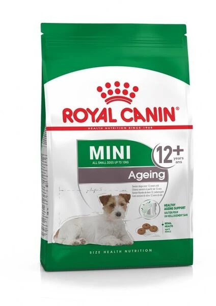 Suitable for small breed dogs over 12 years old that weigh up to 10kg, ROYAL CANIN Mini Ageing 12+ is specially formulated with all the nutritional needs of your small dog in mind.Developed to specifically support healthy ageing in small breed dogs, this formula contains highly beneficial Omega-3 fatty acids such as EPA and DHA, as well as an exclusive complex of antioxidants that help to neutralise the effects of free radicals.ROYAL CANIN Mini Ageing 12+ is also developed with an adapted phosphorus content, this helps to support and maintain healthy kidney function in your dog as it ages.This formula also help to support and maintain the good condition of your dog's skin and coat.To cater to each dog's individual preferences, ROYAL CANIN Mini Ageing 12+ is also available as wet food in delicious gravy. If you're considering mixed feeding, simply follow our feeding guidelines to ensure your dog gets an accurate amount of both wet and dry food for optimal benefit. Healthy ageing support Developed to support healthy ageing in small breed dogs. Contains EPA, DHA and an exclusive complex of antioxidants to help neutralise free radicals. Renal health Developed with an adapted phosphorus content to help support healthy renal system in ageing small breed dogs. Coat condition This formula contains nutrients that help support a healthy skin. Enriched with EPA-DHA. COMPOSITION: rice, maize, dehydrated poultry protein, maize flour, vegetable protein isolate*, maize gluten, animal fats, hydrolysed animal proteins, minerals, beet pulp, fish oil, vegetable fibres, tomato (source of lycopene), soya oil, fructo-oligo-saccharides, hy- drolysed yeast (source of manno-oligo-saccharides), borage oil, marigold extract (source of lutein). ADDITIVES (per kg): Nutritional additives: Vitamin A: 30000 IU, Vitamin D3: 800 IU, E1 (Iron): 46 mg, E2 (Iodine): 4.6 mg, E4 (Copper): 14 mg, E5 (Manganese): 60 mg, E6 (Zinc): 146 mg, E8 (Selenium): 0.1 mg - Sensory additives: Tea extract (source of polyphenols): 150 mg - Preservatives - Antioxidants. ANALYTICAL CONSTITUENTS: Protein: 26.0% - Fat content: 14.0% - Crude ash: 5.0% - Crude fibres: 2.1% - Per kg: EPA/DHA: 4.5 g - Phosphorus: 5 g. FEEDING INSTRUCTIONS: see table. Batch number, factory registration number and best before date: see information on packaging. To be stored in a cool, dry place. *L.I.P.: protein selected for its very high digestibility.