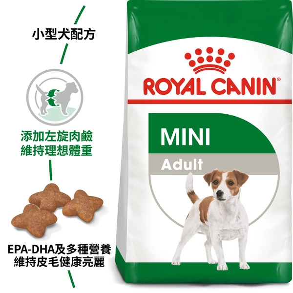 Suitable for small breed dogs over 10 months old that weigh up to 10kg, ROYAL CANIN Mini Adult is specially formulated with all the nutritional needs of your adult mini dog in mind. Because small breed dogs like yours tend to have high energy needs, ROYAL CANIN Mini Adult is formulated with nutrients that help to meet those energy needs, whilst also helping your dog to maintain a healthy weight. Some small breed dogs have fussier appetites than others, that's why ROYAL CANIN Mini Adult's formula contains a selection of exclusive flavourings. It is this enhanced palatability that directly appeals to even the fussiest of dogs. ROYAL CANIN Mini Adult also contains a variety of nutrients that help to support and maintain the health of your dog's skin and coat. To cater to each dog's individual preferences, ROYAL CANIN Mini Adult is also available as wet food in delicious gravy.; If you're considering mixed feeding, simply follow our feeding guidelines to ensure your dog gets an accurate amount of both wet and dry food for optimal benefit. Adapted energy Helps maintain a healthy weight in small breed dogs by perfectly meeting their high energy needs. Contains L-carnitine. Enhanced palatability Satisfies the fussy appetite of small breed dogs by means of its formulation and a selection of exclusive flavourings. Coat condition This formula contains nutrients that help support a healthy skin. Enriched with EPA-DHA. COMPOSITION: dehydrated poultry protein, maize, maize flour, animal fats, maize gluten, vegetable protein isolate*, wheat, hydrolysed animal proteins, rice, beet pulp, minerals, fish oil, soya oil, yeasts and parts thereof, fructo-oligo-saccharides. ADDITIVES (per kg): Nutritional additives: Vitamin A: 22000 IU, Vitamin D3: 1000 IU, E1 (Iron): 41 mg, E2 (Iodine): 4.1 mg, E4 (Copper): 13 mg, E5 (Manganese): 54 mg, E6 (Zinc): 133 mg, E8 (Selenium): 0.1 mg, L-carnitine: 50.0 mg - Preservatives - Antiox- idants. ANALYTICAL CONSTITUENTS: Protein: 27.0% - Fat content: 16.0% - Crude ash: 5.7% - Crude fibres: 1.3% - EPA/DHA: 2.5 g/kg. *L.I.P.: protein selected for its very high digestibility.