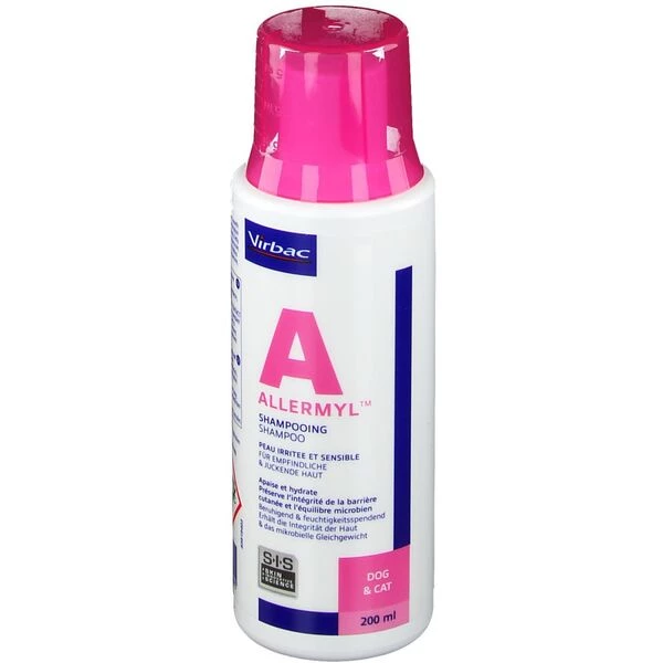 Virbac ALLERMYL Shampoo 200ml is a cleansing shampoo as an aid for the management of allergic skin conditions in dogs and cats, used to help soothe irritated skin.Mild. Contains cleansing Agents, Monosaccharides/Alkyl Poly Glucosides (Virbac Glycotechnology), Skin Lipid Complex (ceramides,essential fatty acids, cholesterol), EFA (omega 6), PiroctoneOlamine, Physiological pH.Reinforce ofthe cutaneous barrier Skin lipid complex(Ceramides, EPAs,cholesterol) Multi-lamellar system, which mimics the structure & composition of intercellular lipids in the stratum corneum