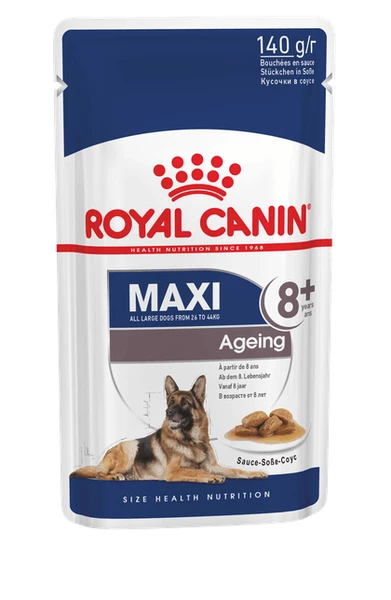 Suitable for all large dogs over 8 years old that weigh between 26-44 kg, ROYAL CANIN Maxi Ageing 8+ in Gravy is specially formulated with all the nutritional needs of your large adult dog in mind.ROYAL CANIN Maxi Ageing 8+ in Gravy is developed to support healthy ageing in large breed dogs like yours. It's enriched with an exclusive complex of antioxidants to help neutralise free radicals.It also contains EPA and DHA – Omega-3 fatty acids that help to support your dog's bones and joints as it ages. Maintaining the health of your dog's bones and joints is essential at this stage of its life, particularly for large breed dogs as they have more bodyweight to support.What's more, ROYAL CANIN Maxi Ageing 8+ in Gravy contains very high quality protein – specifically chosen for its high digestibility.To cater to each dog's individual preferences, ROYAL CANIN Maxi Ageing 8+ is also available as dry food, with crunchy and tasty kibble. If you're considering mixed feeding, simply follow our feeding guidelines to ensure your dog gets an accurate amount of both wet and dry food for optimal benefit. Healthy ageing support Contains EPA, DHA and an exclusive complex of antioxidants to help neutralise free radicals. Bone & joint support Helps maintain healthy bones and joints in ageing large breed dogs. High digestibility Helps support digestive health and a balance in the intestinal flora. COMPOSITION: meat and animal derivatives, cereals, derivatives of vegetable origin, oils and fats, vegetable protein extracts, minerals, vegetables, various sugars, molluscs and crustaceans. ADDITIVES (per kg): Nutritional additives: Vitamin D3: 200 IU, E1 (Iron): 6 mg, E2 (Iodine): 0.2 mg, E4 (Copper): 1.9 mg, E5 (Manganese): 1.9 mg, E6 (Zinc): 19 mg - Technological additives: Clinoptilolite of sedimentary origin: 2 g. ANALYTICAL CONSTITUENTS: Protein: 8.0% - Fat content: 5.5% - Crude ash: 1.4% - Crude fibres: 1.4% - Moisture: 81.0% - EPA and DHA: 0.115%. FEEDING INSTRUCTIONS: see table. Batch number, factory registration number and best before date: see information on packaging. To be stored in a cool, dry place.
