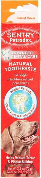 Go 100% natural with our Petrodex Toothpaste. Our special formula contains only natural abrasives to safely remove plaque while brushing. No artificial preservatives or additives. Tasty, peanut butter flavor. Brushing teeth helps prevent bad breath and gum disease. Directions: To introduce your dog to the toothpaste, apply a small amount onto your finger and allow the dog to taste. Next, apply a small amount onto a Petrodex toothbrush. Then, gently pull the lips and cheeks up. Begin brushing with short, back-and-forth strokes at the gumline. Brush only a few teeth the first time. Give a lot of praise during the process. Avoid using human toothpaste on your pet. Warnings: Avoid contact with eyes. KEEP OUT OF REACH OF CHILDREN. Store at room temperature. Ingredients: Sorbitol, hydrated silica, glycerin, purified water, natural flavor (peanut), xanthan gum, mushroom extract, benzoic acid, sodium copper chlorophyllin, eucalyptus oil, parsley seed oil.